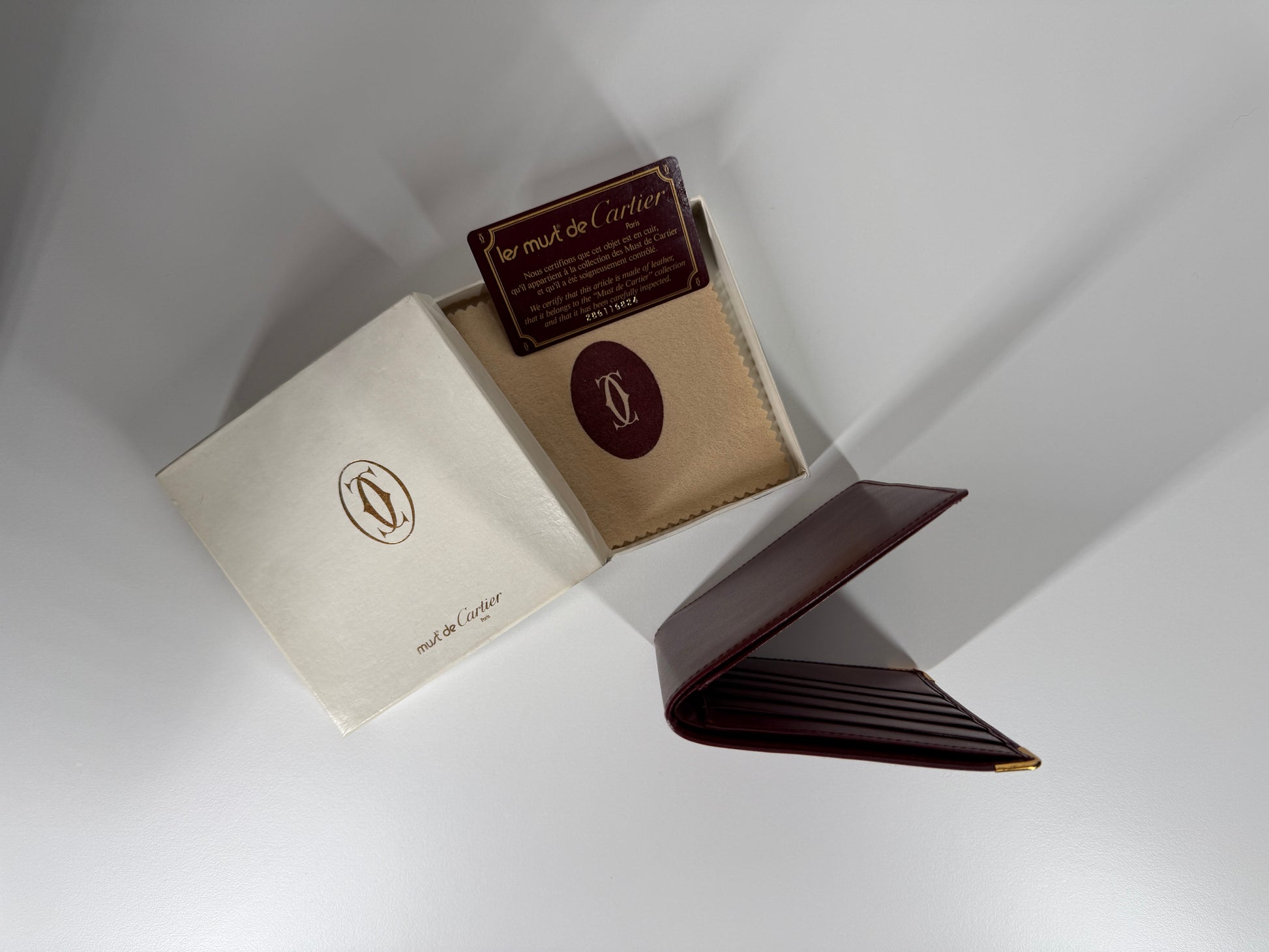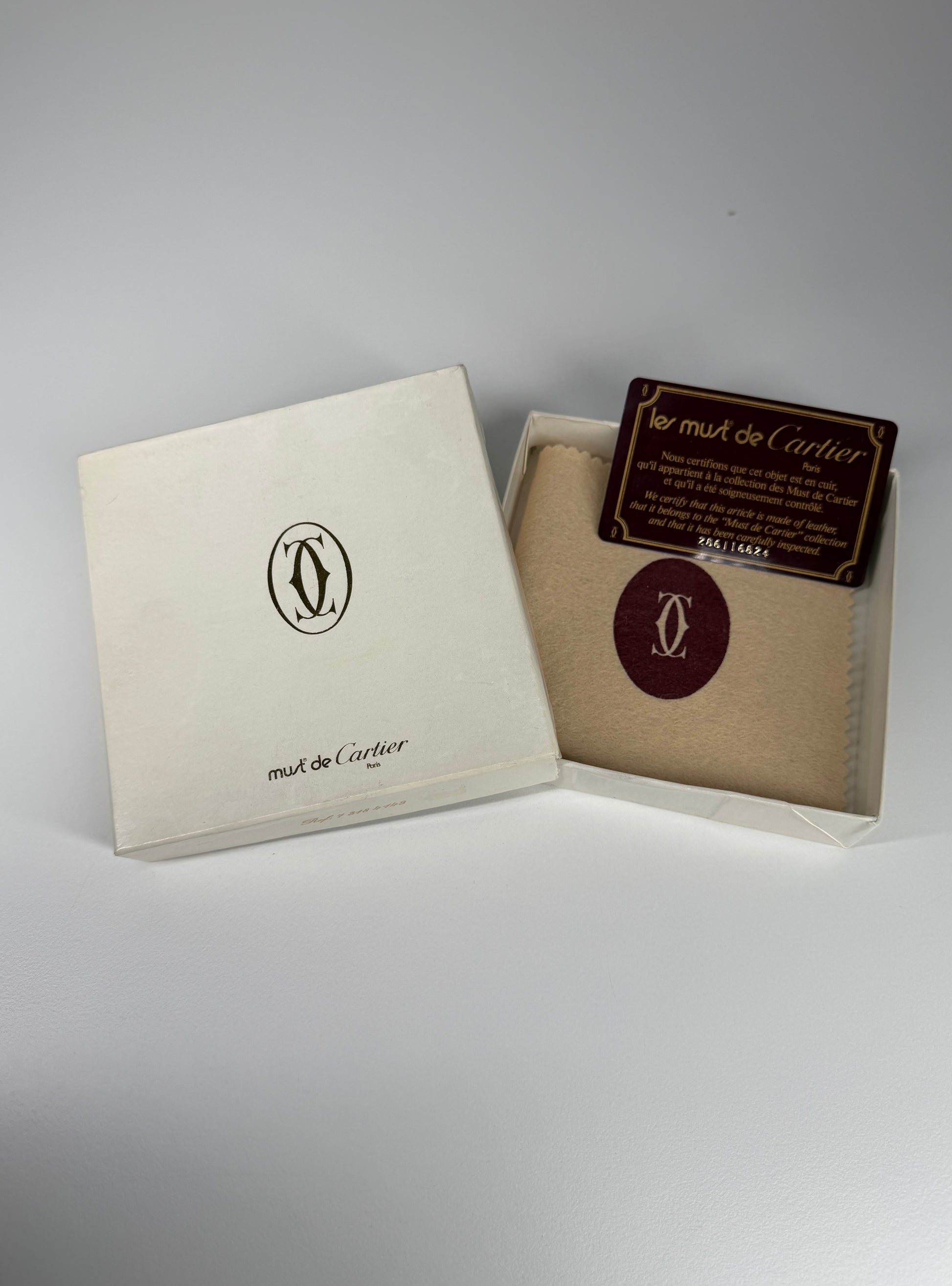 This piece comes as a full set, including the original box, dust cloth, and authenticity card with boutique stamp, making it a rare and highly collectible example of Cartier leather goods.