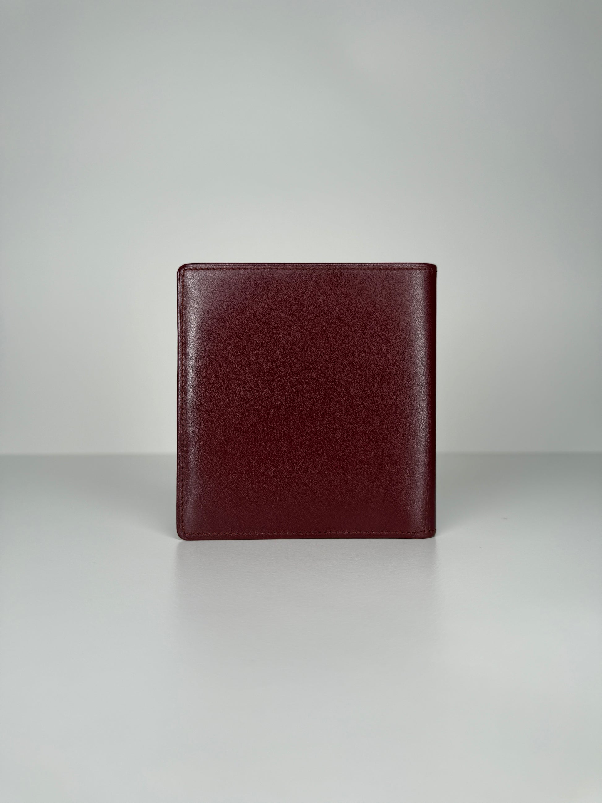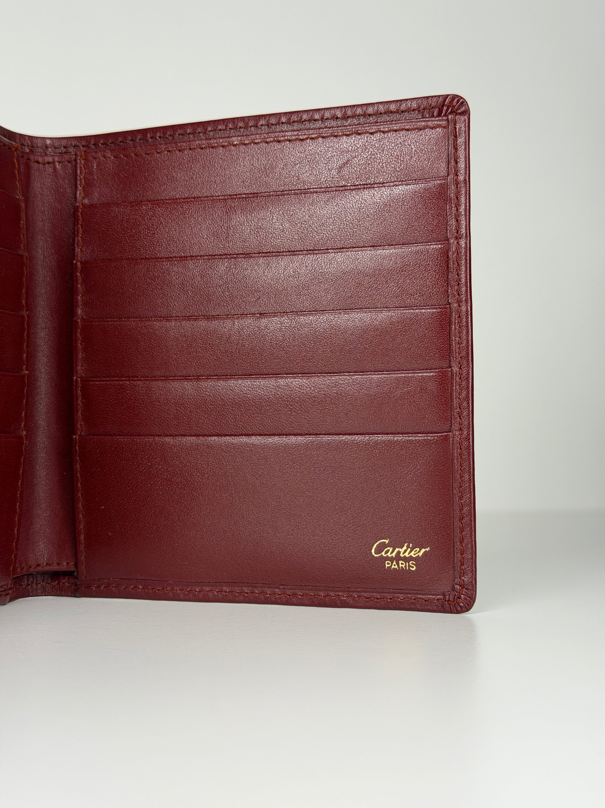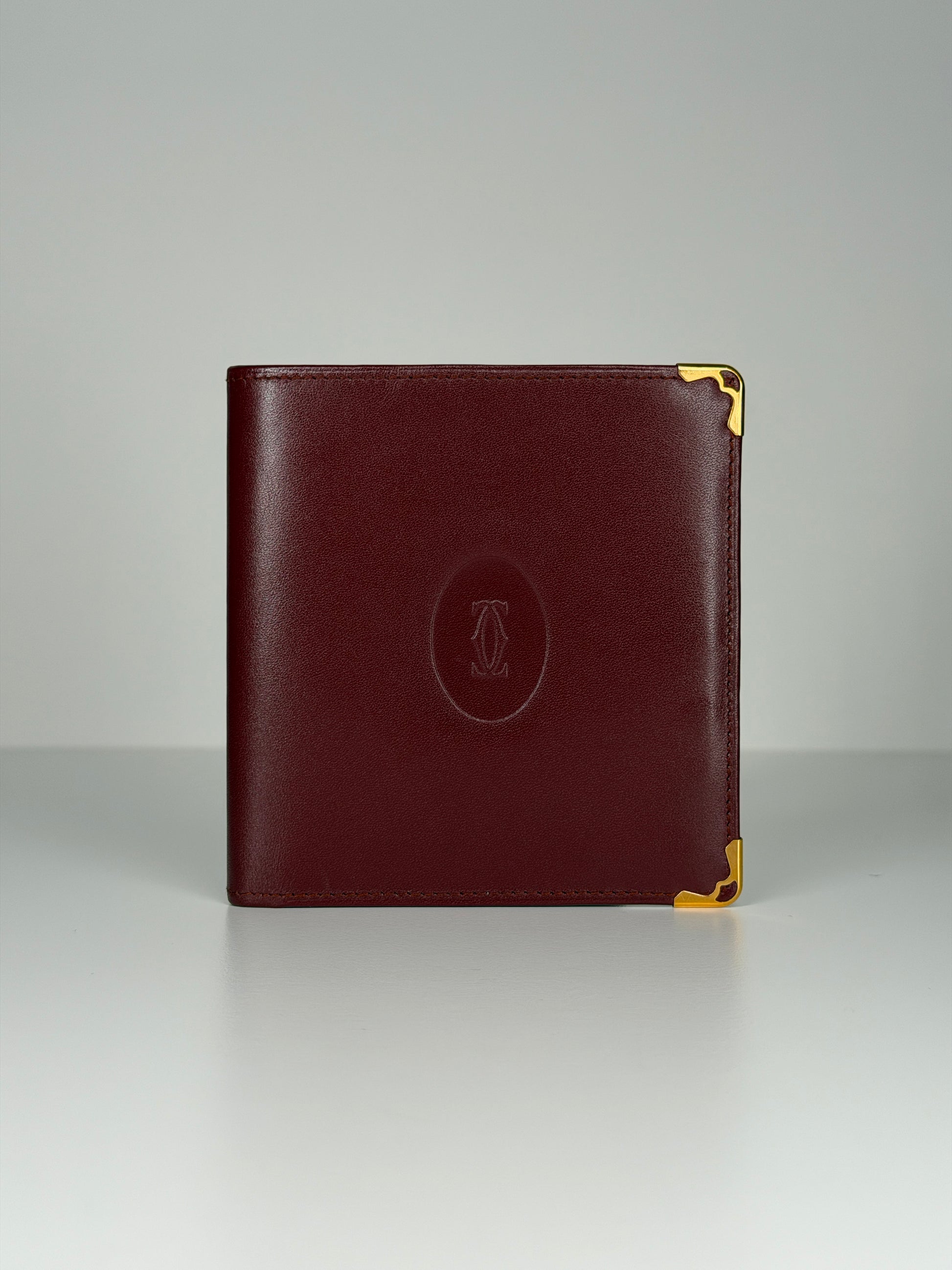 Vintage Must de Cartier bi-fold wallet in rich bordeaux leather, finished with signature gold-tone corner hardware and the embossed Cartier monogram.