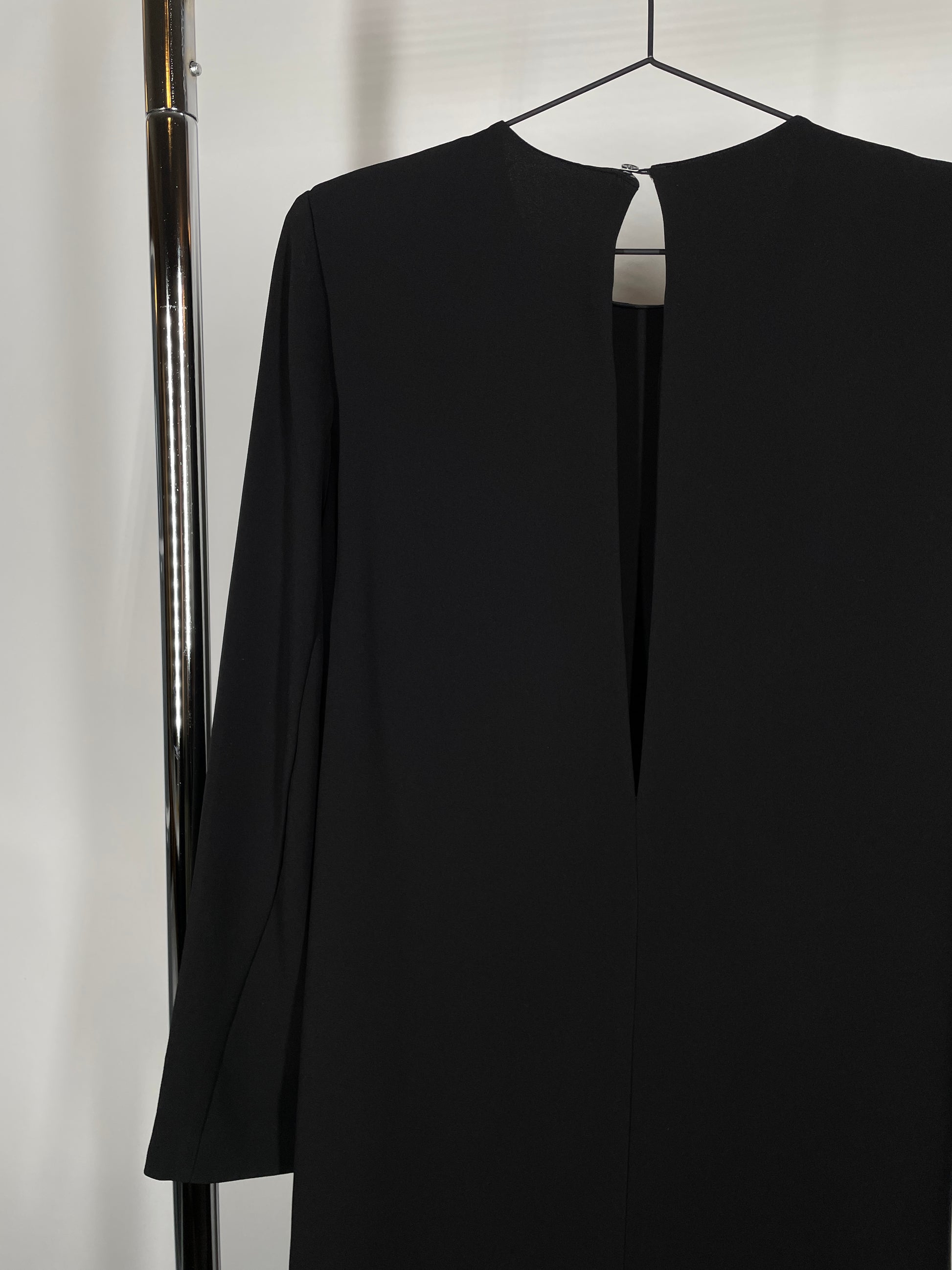 notes - side leg slit, slit on wrist, satin ribbon detail near neckline, bust darts