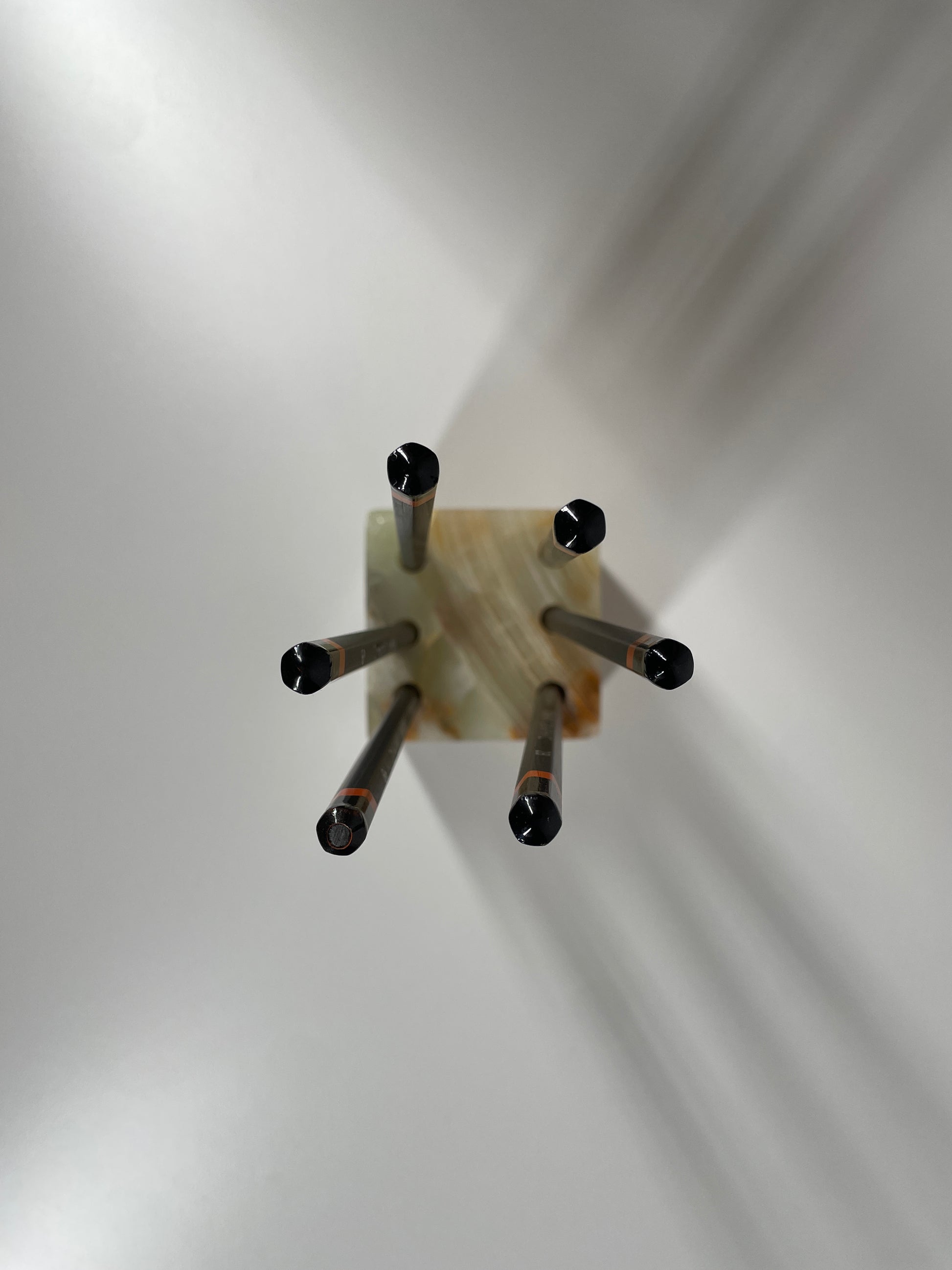 Solid onyx pencil holder with striking natural veining ā a beautifully weighted piece that adds a touch of quiet elegance to any desk. The warm caramel and cream tones give it a sculptural, mid-century feel.