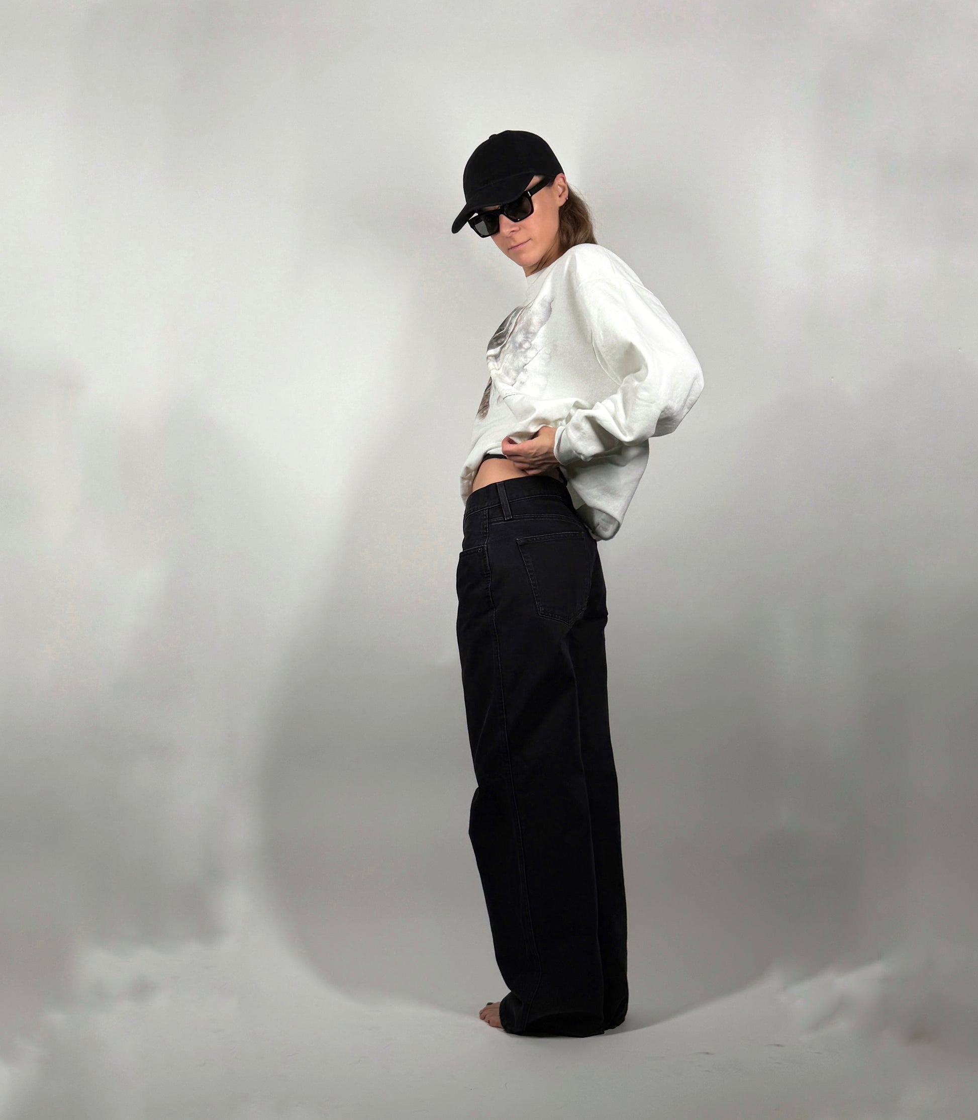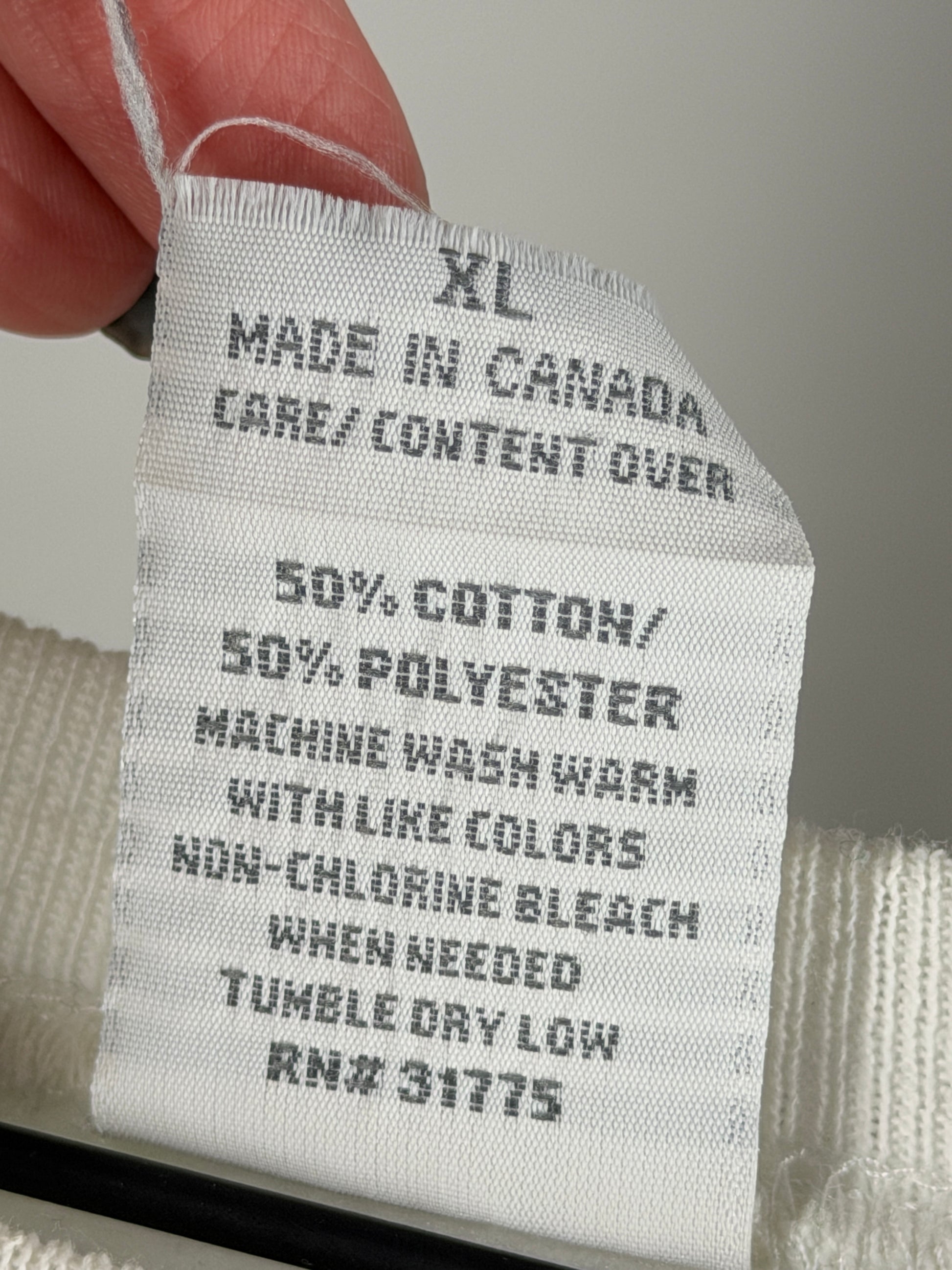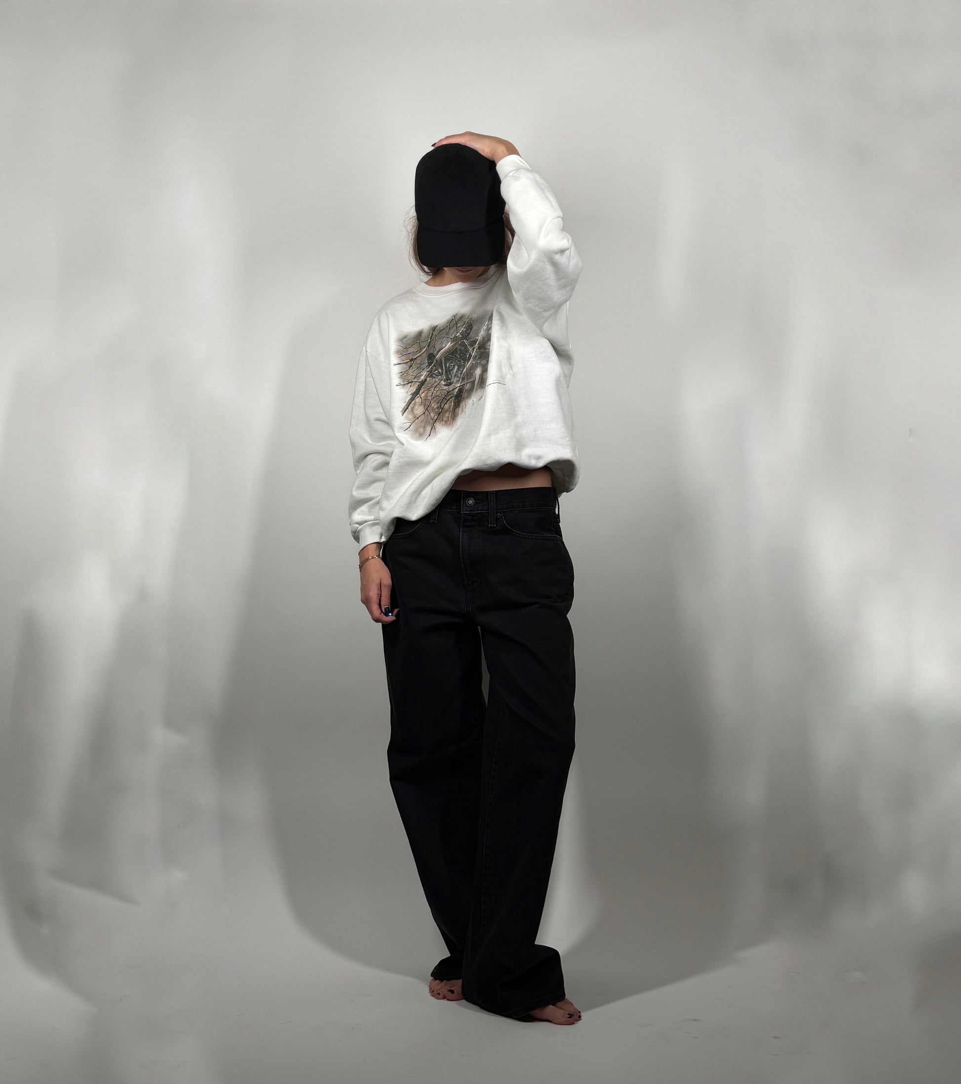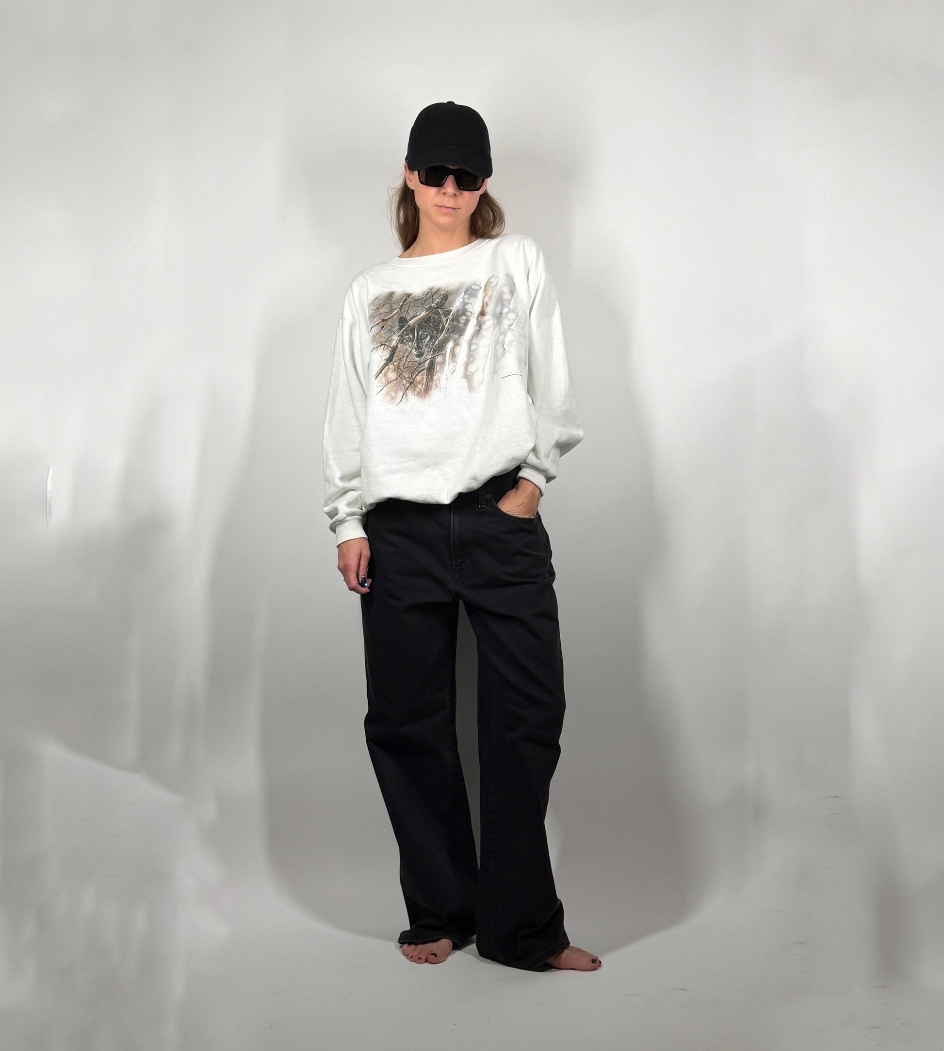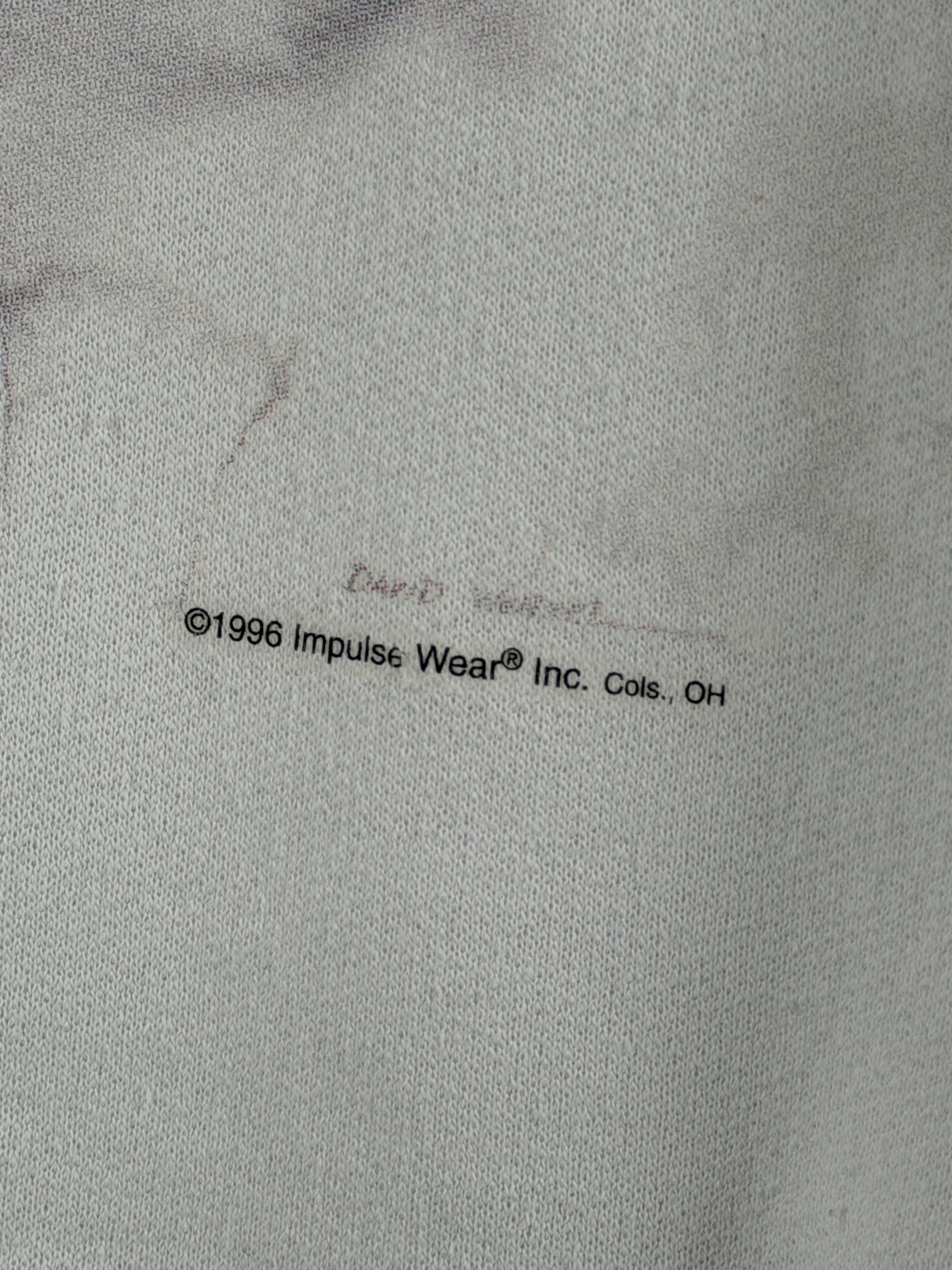 A 1996 wildlife graphic sweatshirt featuring a soft, painterly wolf illustration by Impulse Wear. Made in Canada on a classic 50/50 fleece with that authentic 90s weight and texture. The print is crisp and fully intact — a muted, woodland palette with a washed, atmospheric feel.