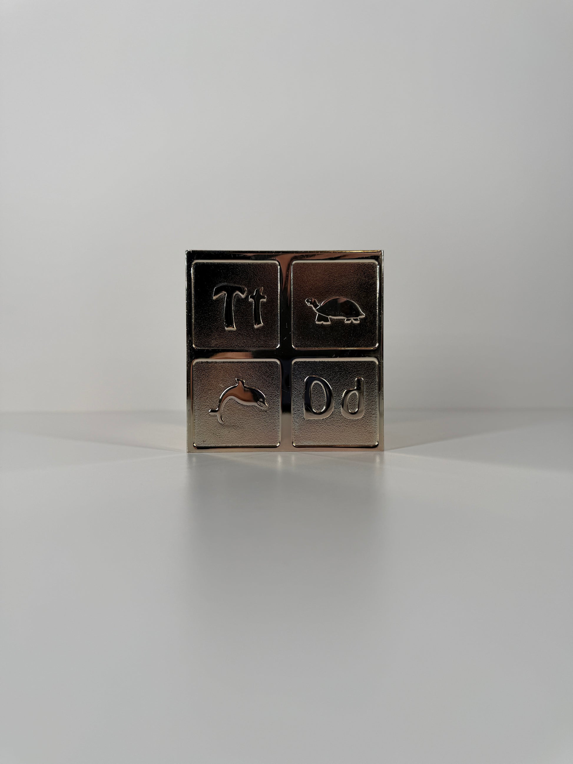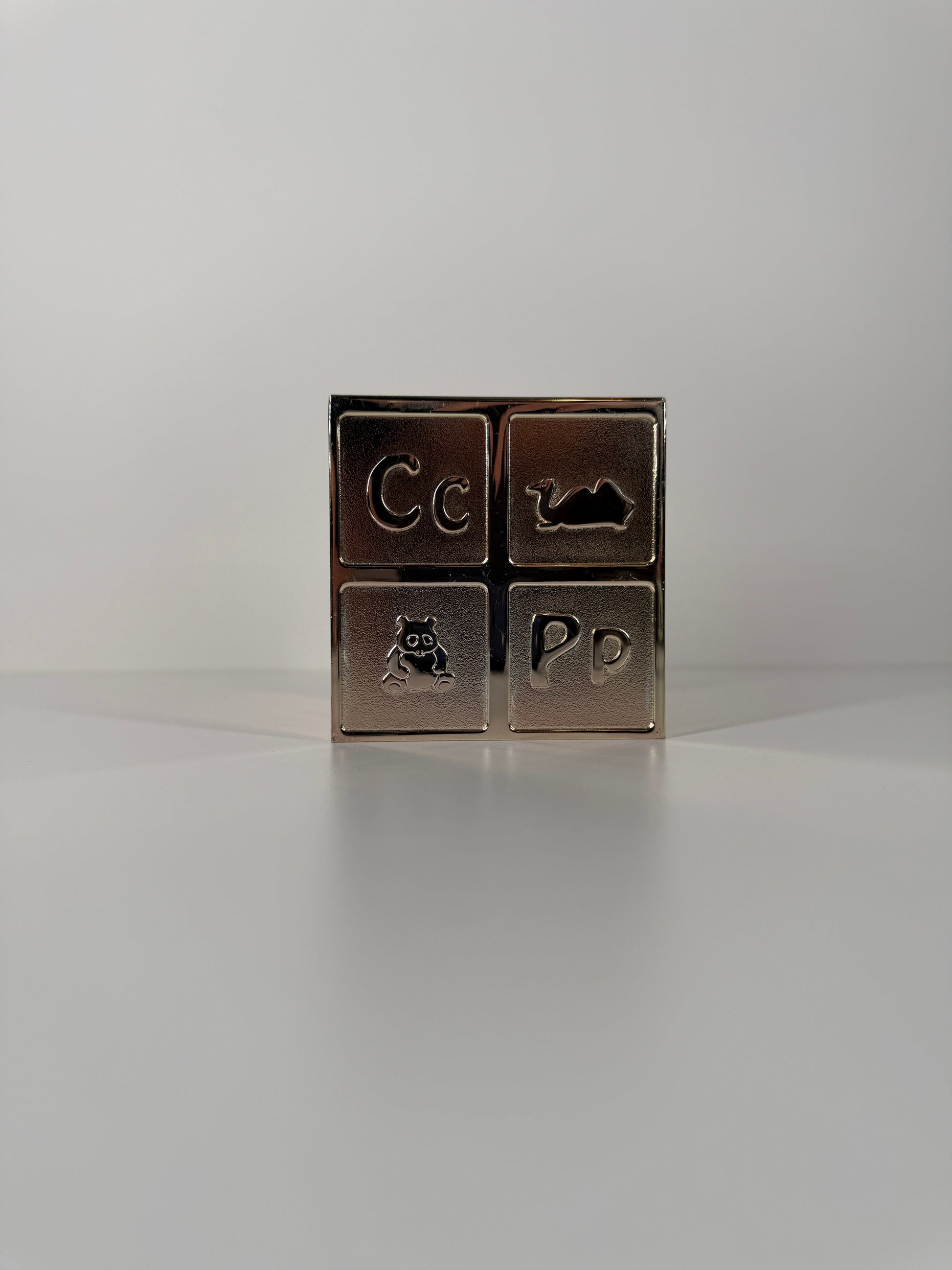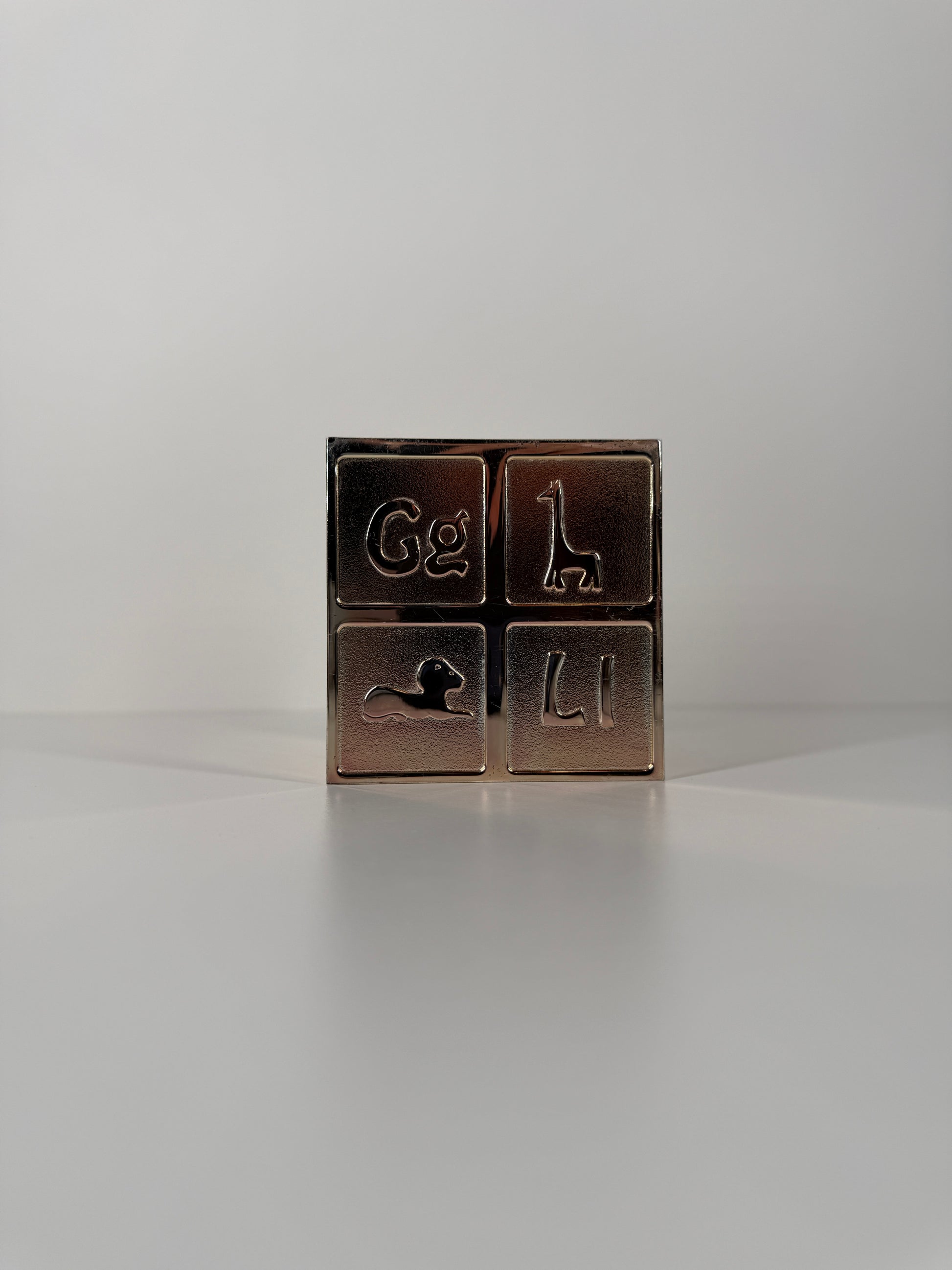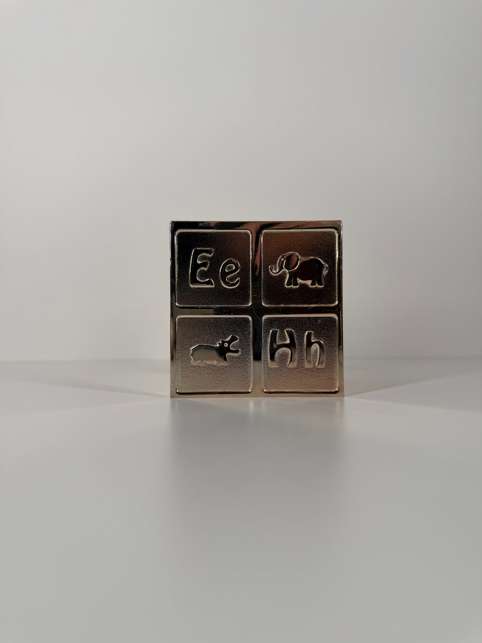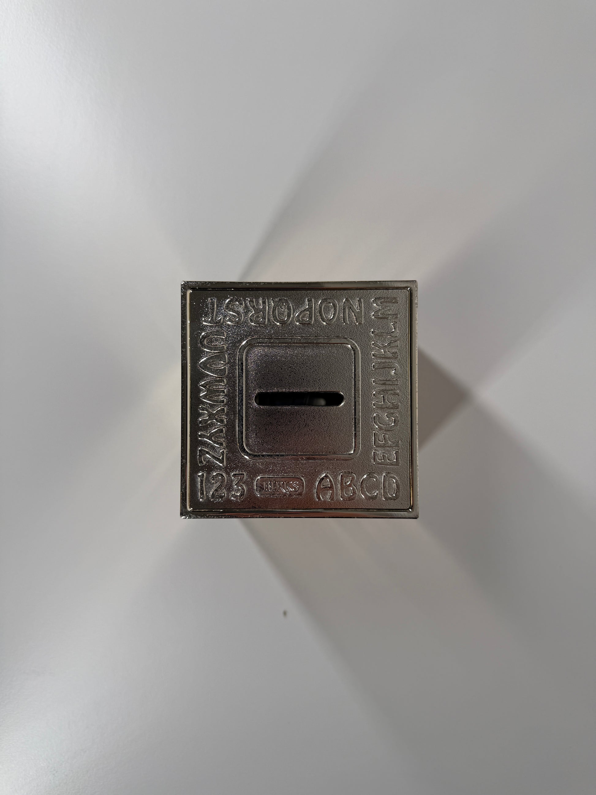 A sculptural vintage Birks silverplate piggy bank, designed as a cube with raised alphabet letters and animal motifs on each side. Graphic, weighty, and quietly playful — the kind of object that reads more like desk art than décor.