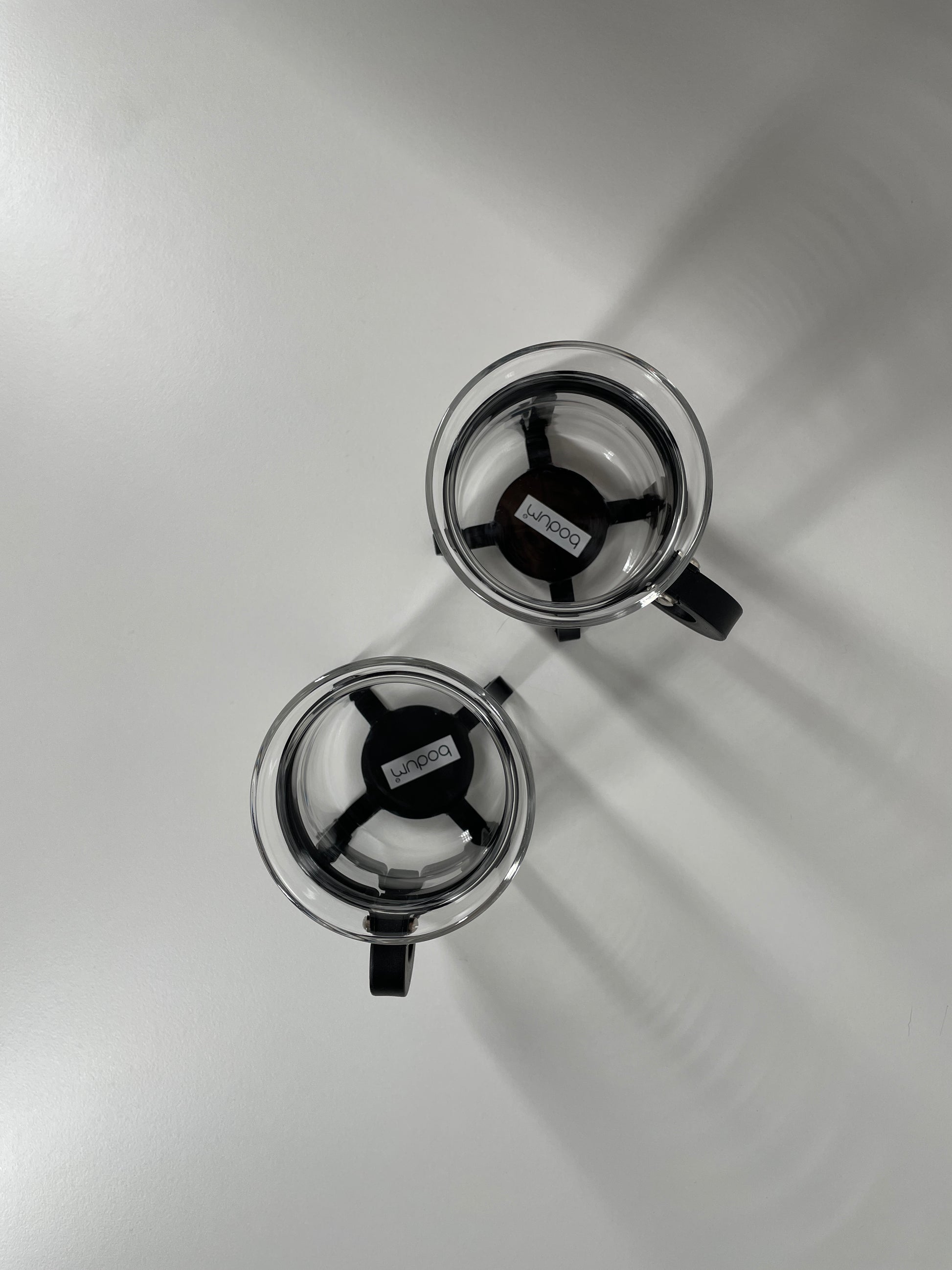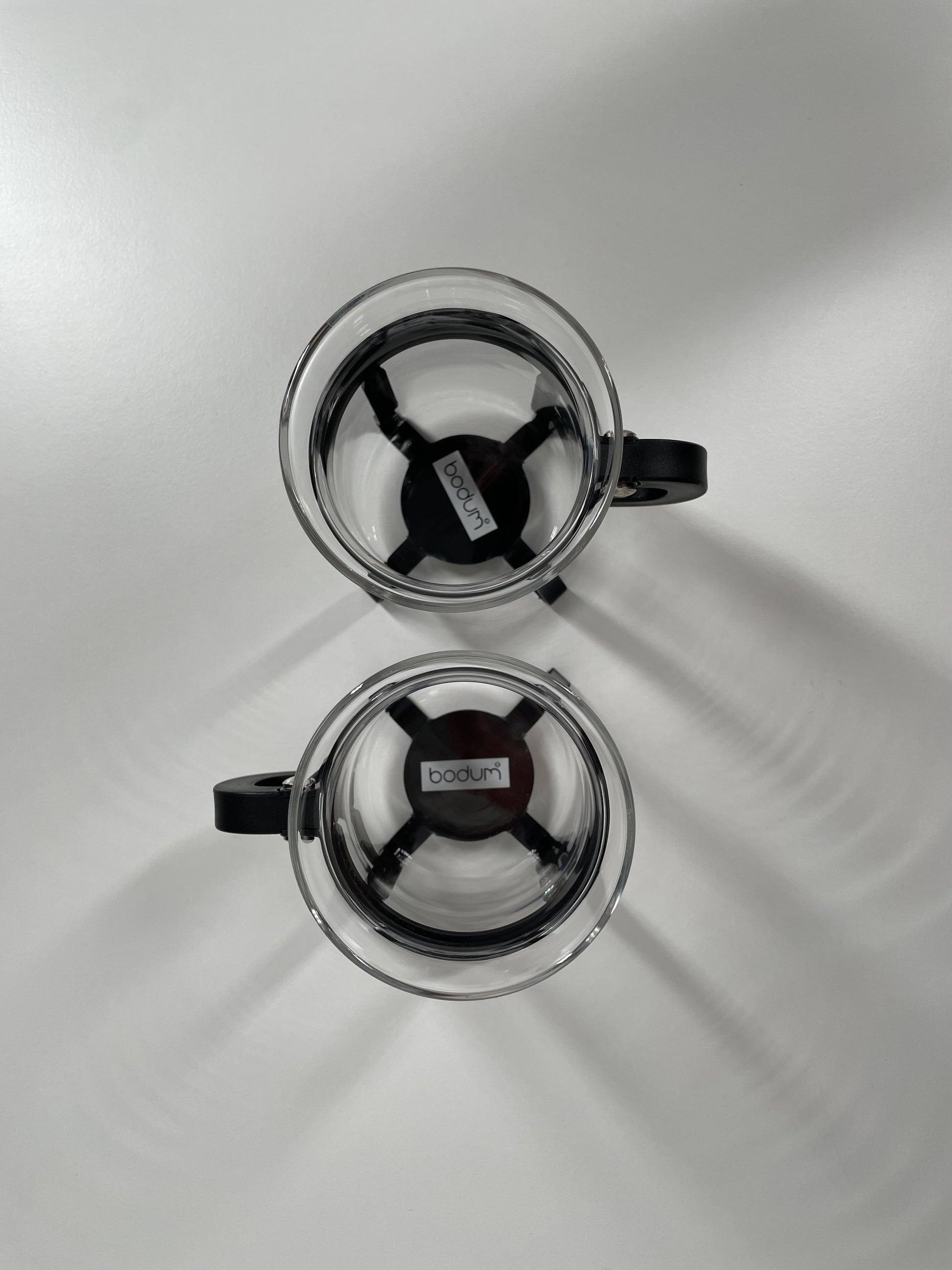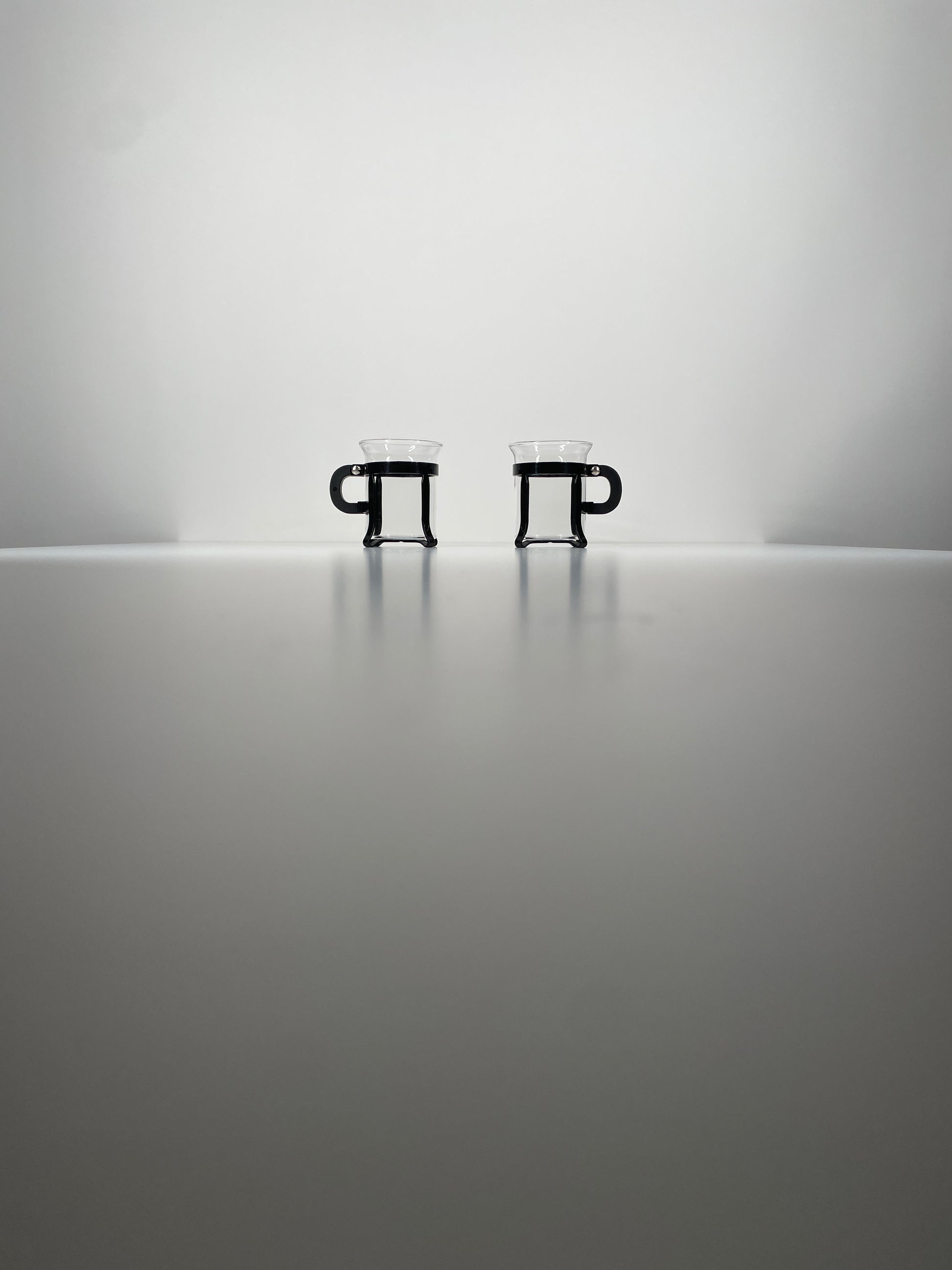 Clear borosilicate cups framed in matte black — graphic, balanced, quietly industrial. Designed to elevate something as simple as coffee or tea into a small ritual.