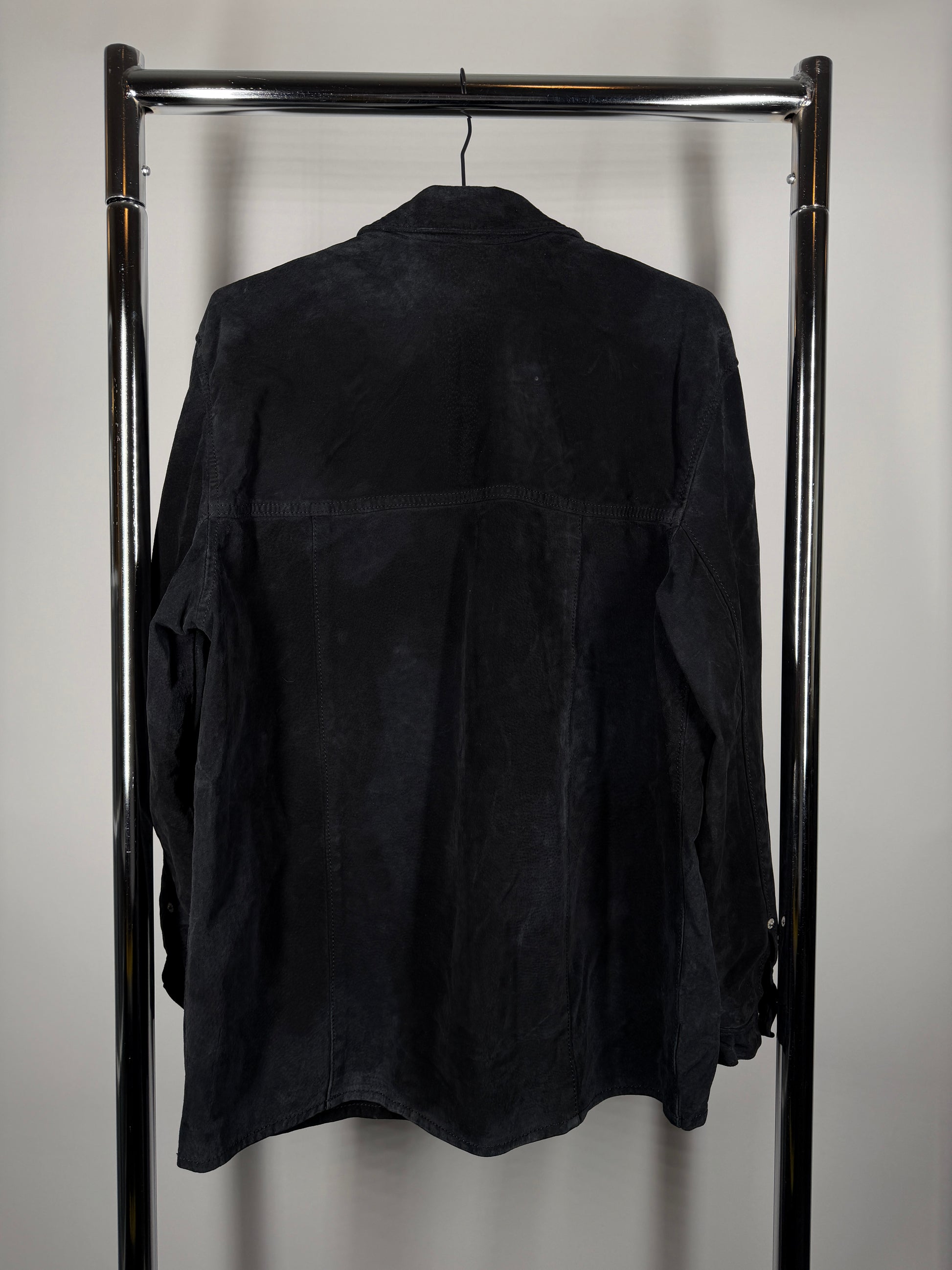 A beautiful weighty suede shirt-jacket in a washed black finish — the kind of piece that only gets better with age. Soft, broken-in texture with that perfectly worn look. Features a single chest pocket, snap-front closure, and a relaxed oversized fit (looks great worn open over a tee or layered for colder weather).