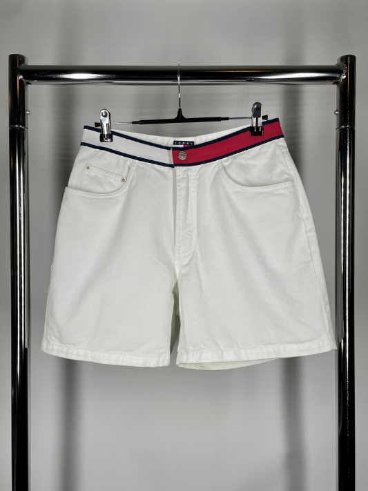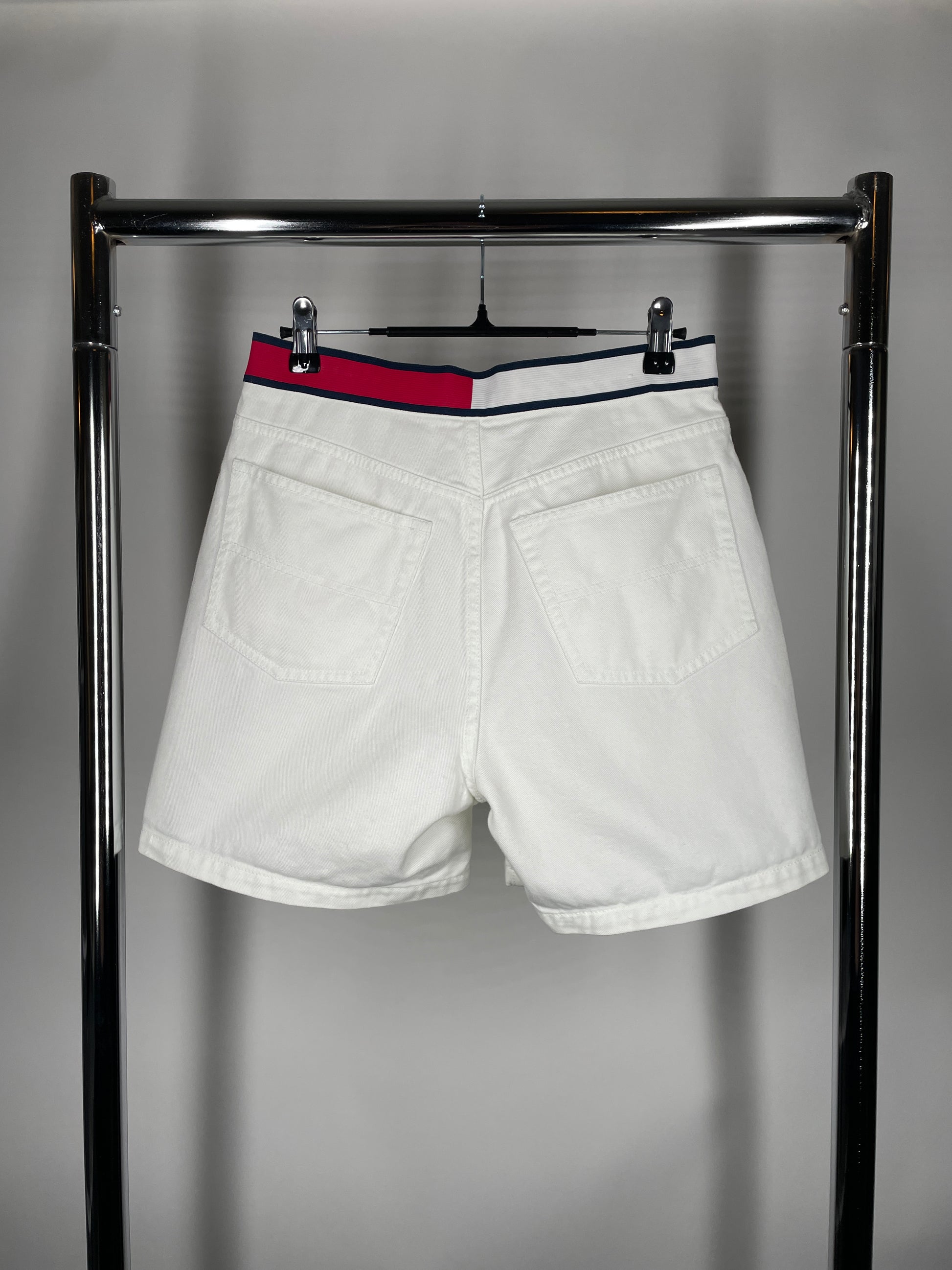 Crisp white cotton with that bold red, white + navy waistband — peak 90s Tommy. So good with a tank or tee all summer.